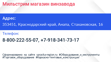 Мильстрим, магазин винзавода по адресу 353451, Краснодарский край, Анапа, Стахановская, 16 в дальнейшем Организация, размещена в следующих категориях: