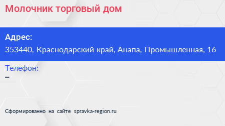 Молочник, торговый дом по адресу 353440, Краснодарский край, Анапа, Промышленная, 16 в дальнейшем Организация, размещена в следующих категориях: