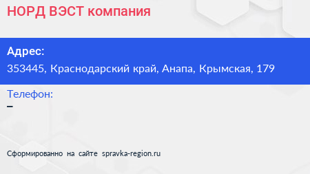 НОРД-ВЭСТ, компания по адресу 353445, Краснодарский край, Анапа, Крымская, 179 в дальнейшем Организация, размещена в следующих категориях: