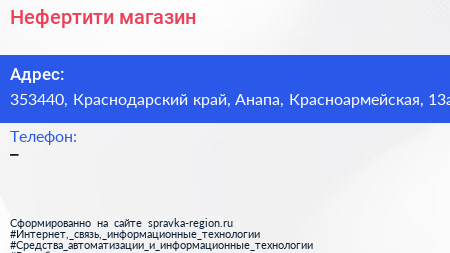 Нефертити, магазин по адресу 353440, Краснодарский край, Анапа, Красноармейская, 13а в дальнейшем Организация, размещена в следующих категориях:
