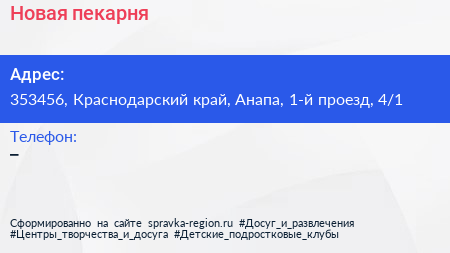 Новая, пекарня по адресу 353456, Краснодарский край, Анапа, 1-й проезд, 4/1 в дальнейшем Организация, размещена в следующих категориях: