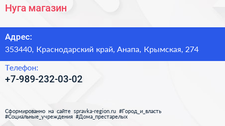 Нуга, магазин по адресу 353440, Краснодарский край, Анапа, Крымская, 274 в дальнейшем Организация, размещена в следующих категориях: