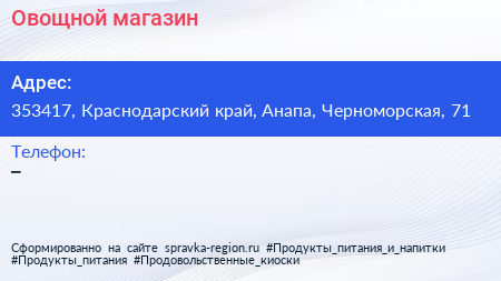 Овощной магазин по адресу 353417, Краснодарский край, Анапа, Черноморская, 71 в дальнейшем Организация, размещена в следующих категориях: