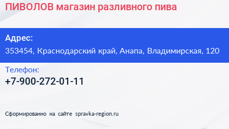 ПИВОЛОВ, магазин разливного пива по адресу 353454, Краснодарский край, Анапа, Владимирская, 120 в дальнейшем Организация, размещена в следующих категориях: