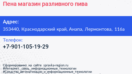 Пена, магазин разливного пива по адресу 353440, Краснодарский край, Анапа, Лермонтова, 116а в дальнейшем Организация, размещена в следующих категориях:
