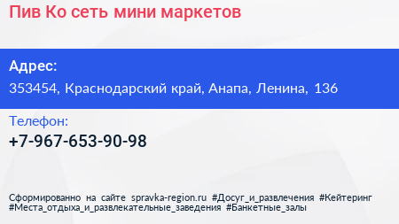 Пив & Ко, сеть мини-маркетов по адресу 353454, Краснодарский край, Анапа, Ленина, 136 в дальнейшем Организация, размещена в следующих категориях: