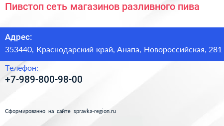 Пивстоп, сеть магазинов разливного пива по адресу 353440, Краснодарский край, Анапа, Новороссийская, 281 в дальнейшем Организация, размещена в следующих категориях:
