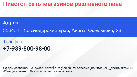 Пивстоп, сеть магазинов разливного пива по адресу 353454, Краснодарский край, Анапа, Омелькова, 28 в дальнейшем Организация, размещена в следующих категориях: