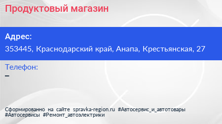 Продуктовый магазин по адресу 353445, Краснодарский край, Анапа, Крестьянская, 27 в дальнейшем Организация, размещена в следующих категориях:
