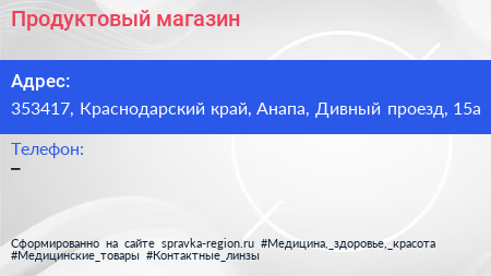 Продуктовый магазин по адресу 353417, Краснодарский край, Анапа, Дивный проезд, 15а в дальнейшем Организация, размещена в следующих категориях: