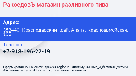 РакоедовЪ, магазин разливного пива по адресу 353440, Краснодарский край, Анапа, Красноармейская, 10Б в дальнейшем Организация, размещена в следующих категориях: