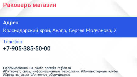 Раковаръ, магазин по адресу Краснодарский край, Анапа, Сергея Молчанова, 2 в дальнейшем Организация, размещена в следующих категориях: