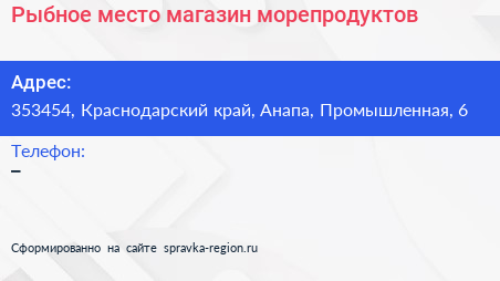 Рыбное место, магазин морепродуктов по адресу 353454, Краснодарский край, Анапа, Промышленная, 6 в дальнейшем Организация, размещена в следующих категориях: