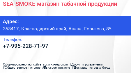SEA SMOKE, магазин табачной продукции по адресу 353417, Краснодарский край, Анапа, Горького, 85 в дальнейшем Организация, размещена в следующих категориях: