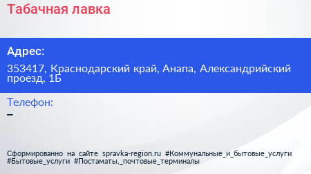Табачная лавка по адресу 353417, Краснодарский край, Анапа, Александрийский проезд, 1Б в дальнейшем Организация, размещена в следующих категориях: