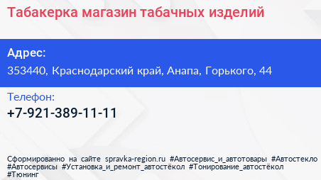 Табакерка, магазин табачных изделий по адресу 353440, Краснодарский край, Анапа, Горького, 44 в дальнейшем Организация, размещена в следующих категориях: