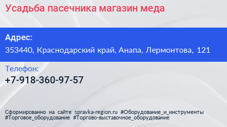Усадьба пасечника, магазин меда по адресу 353440, Краснодарский край, Анапа, Лермонтова, 121 в дальнейшем Организация, размещена в следующих категориях: