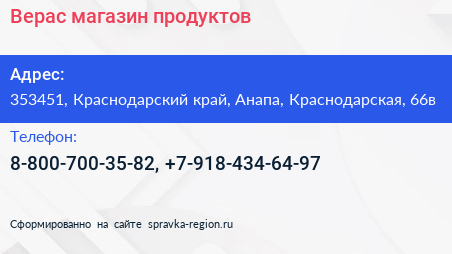 Верас, магазин продуктов по адресу 353451, Краснодарский край, Анапа, Краснодарская, 66в в дальнейшем Организация, размещена в следующих категориях: