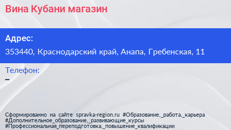 Вина Кубани, магазин по адресу 353440, Краснодарский край, Анапа, Гребенская, 11 в дальнейшем Организация, размещена в следующих категориях: