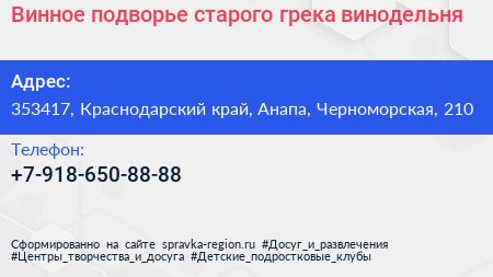 Винное подворье старого грека, винодельня по адресу 353417, Краснодарский край, Анапа, Черноморская, 210 в дальнейшем Организация, размещена в следующих категориях: