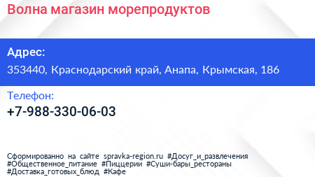 Волна, магазин морепродуктов по адресу 353440, Краснодарский край, Анапа, Крымская, 186 в дальнейшем Организация, размещена в следующих категориях: