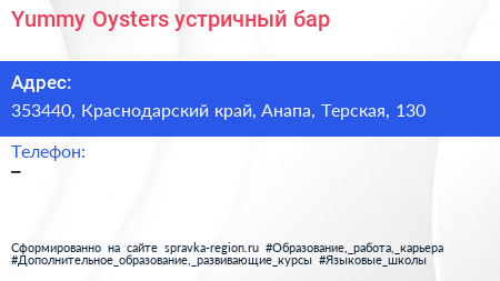 Yummy Oysters, устричный бар по адресу 353440, Краснодарский край, Анапа, Терская, 130 в дальнейшем Организация, размещена в следующих категориях: