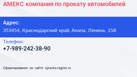 АМЕКС, компания по прокату автомобилей по адресу 353454, Краснодарский край, Анапа, Ленина, 158 в дальнейшем Организация, размещена в следующих категориях: