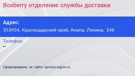 Boxberry, отделение службы доставки по адресу 353454, Краснодарский край, Анапа, Ленина, 146 в дальнейшем Организация, размещена в следующих категориях: