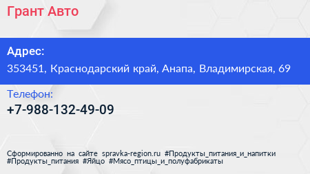Грант Авто по адресу 353451, Краснодарский край, Анапа, Владимирская, 69 в дальнейшем Организация, размещена в следующих категориях: