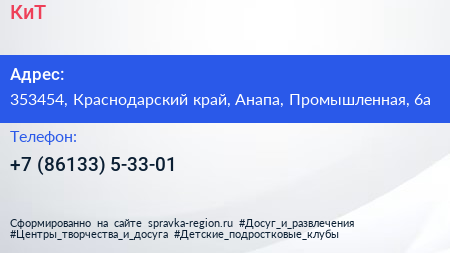 КиТ по адресу 353454, Краснодарский край, Анапа, Промышленная, 6а в дальнейшем Организация, размещена в следующих категориях: