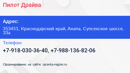 Пилот Драйва по адресу 353451, Краснодарский край, Анапа, Супсехское шоссе, 33а в дальнейшем Организация, размещена в следующих категориях: