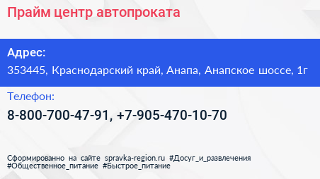 Прайм, центр автопроката по адресу 353445, Краснодарский край, Анапа, Анапское шоссе, 1г в дальнейшем Организация, размещена в следующих категориях: