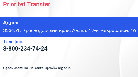 Prioritet Transfer по адресу 353451, Краснодарский край, Анапа, 12-й микрорайон, 16 в дальнейшем Организация, размещена в следующих категориях:
