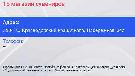 №15, магазин сувениров по адресу 353440, Краснодарский край, Анапа, Набережная, 34а в дальнейшем Организация, размещена в следующих категориях: