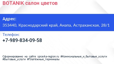 BOTANIK, салон цветов по адресу 353440, Краснодарский край, Анапа, Астраханская, 28/1 в дальнейшем Организация, размещена в следующих категориях: