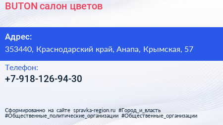 BUTON, салон цветов по адресу 353440, Краснодарский край, Анапа, Крымская, 57 в дальнейшем Организация, размещена в следующих категориях:
