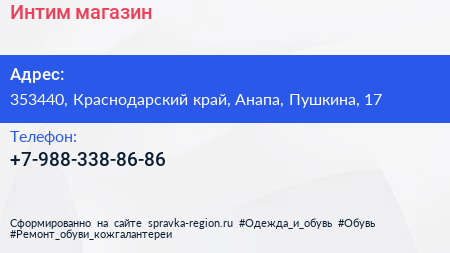 Интим, магазин по адресу 353440, Краснодарский край, Анапа, Пушкина, 17 в дальнейшем Организация, размещена в следующих категориях: