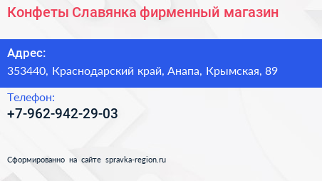 Конфеты Славянка, фирменный магазин по адресу 353440, Краснодарский край, Анапа, Крымская, 89 в дальнейшем Организация, размещена в следующих категориях: