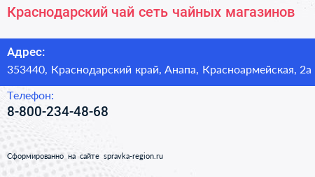 Краснодарский чай, сеть чайных магазинов по адресу 353440, Краснодарский край, Анапа, Красноармейская, 2а в дальнейшем Организация, размещена в следующих категориях: