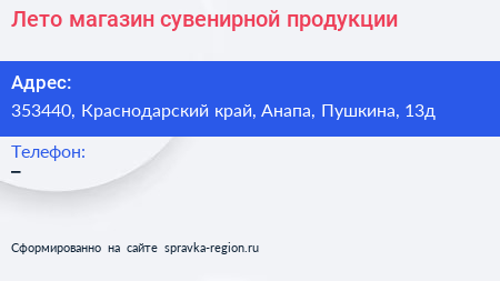 Лето, магазин сувенирной продукции по адресу 353440, Краснодарский край, Анапа, Пушкина, 13д в дальнейшем Организация, размещена в следующих категориях: