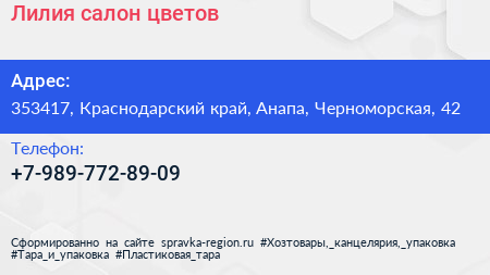 Лилия, салон цветов по адресу 353417, Краснодарский край, Анапа, Черноморская, 42 в дальнейшем Организация, размещена в следующих категориях: