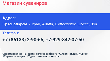 Магазин сувениров по адресу Краснодарский край, Анапа, Супсехское шоссе, 89а в дальнейшем Организация, размещена в следующих категориях: