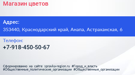 Магазин цветов по адресу 353440, Краснодарский край, Анапа, Астраханская, 6 в дальнейшем Организация, размещена в следующих категориях: