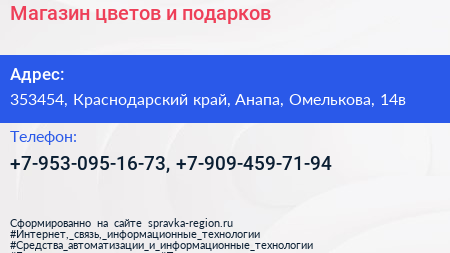 Магазин цветов и подарков по адресу 353454, Краснодарский край, Анапа, Омелькова, 14в в дальнейшем Организация, размещена в следующих категориях: