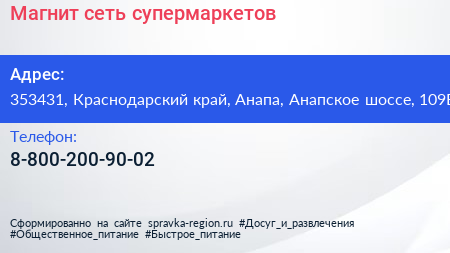 Магнит, сеть супермаркетов по адресу 353431, Краснодарский край, Анапа, Анапское шоссе, 109Б в дальнейшем Организация, размещена в следующих категориях: