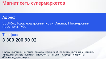 Магнит, сеть супермаркетов по адресу 353456, Краснодарский край, Анапа, Пионерский проспект, 70а в дальнейшем Организация, размещена в следующих категориях: