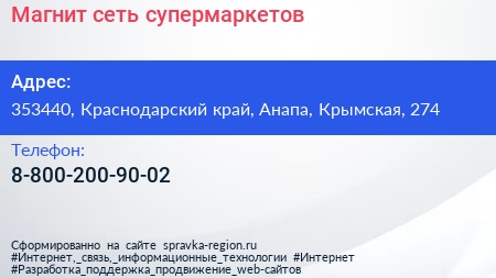 Магнит, сеть супермаркетов по адресу 353440, Краснодарский край, Анапа, Крымская, 274 в дальнейшем Организация, размещена в следующих категориях: