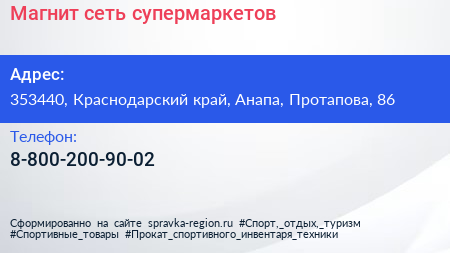 Магнит, сеть супермаркетов по адресу 353440, Краснодарский край, Анапа, Протапова, 86 в дальнейшем Организация, размещена в следующих категориях:
