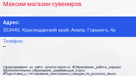 Максим, магазин сувениров по адресу 353440, Краснодарский край, Анапа, Горького, 4а в дальнейшем Организация, размещена в следующих категориях: