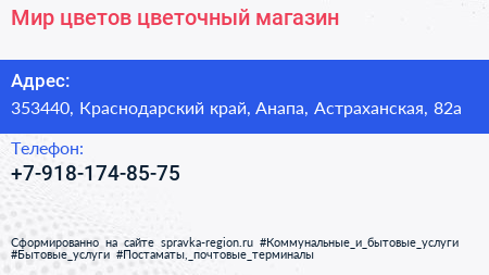 Мир цветов, цветочный магазин по адресу 353440, Краснодарский край, Анапа, Астраханская, 82а в дальнейшем Организация, размещена в следующих категориях: